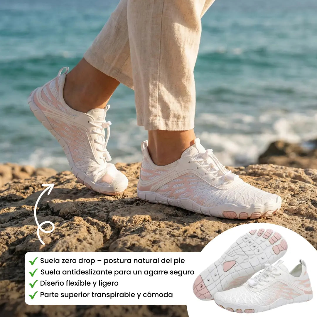 Estos zapatos barefoot están diseñados con suela zero drop, lo que significa que no hay diferencia de altura entre el talón y la parte delantera. Esto favorece una postura más natural al caminar y una sensación más equilibrada en cada paso.